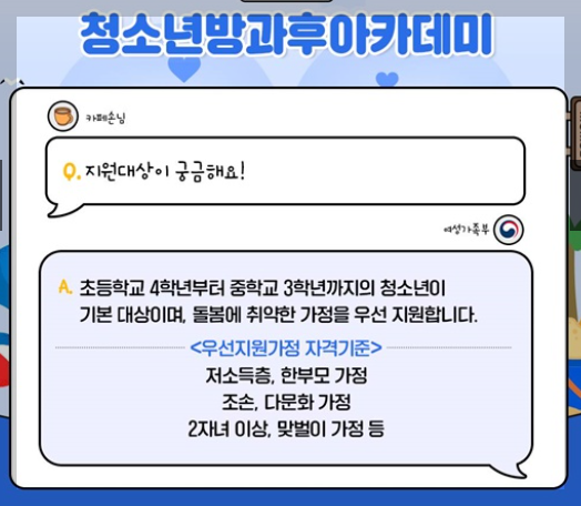 청소년방과후아카데미의 지원대상은 초등학교 4학년부터 중학교 3학년까지 청소년으로 정의되며, 특히 돌봄이 필요한 가정을 우선적으로 선정합니다.