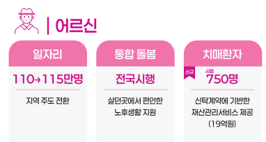고령자 지원도 눈에 띕니다. 올해부터는 지역 주도 일자리 115만 개를 목표로 하며, 치매 환자를 위한 재산관리서비스도 신설되어 돌봄 지원이 한층 강화됩니다.