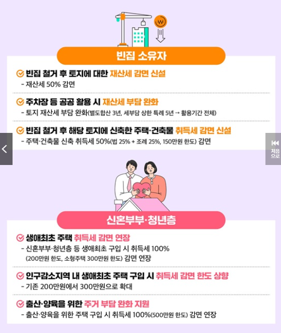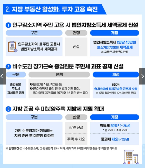 빈집 소유주에 대한 토지 재산세 50% 감면과 신축 건축물 취득세 감면도 큰 변화입니다. 이 밖에 장기임대 주택 취득세 중과세 제외 등 다양한 세제 지원은 주택 시장 안정과 지역 활성화에 도움이 됩니다.