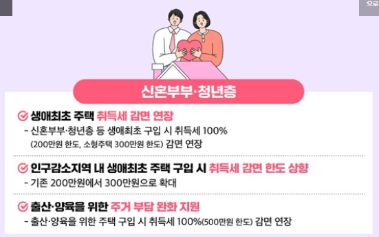 생애최초 주택 구입 시 취득세 100% 감면 혜택이 연장되었으며, 감면 한도도 300만 원으로 확대되었습니다. 이는 신혼부부가 내 집을 마련하는 데 실질적인 도움을 줍니다.