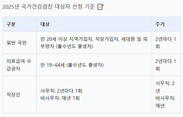 국가건강검진 항목과 주기는 매년 일부 변경될 수 있으니 국민건강공단 홈페이지에서 최신 정보를 반드시 확인하시기 바랍니다.