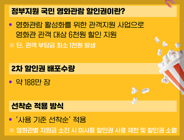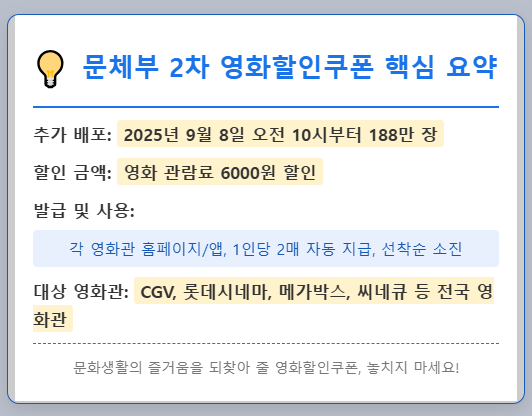 문화체육관광부와 영화진흥위원회가 주관하는 영화 관람료 6,000원 할인권이 2025년 9월 8일 오전 10시부터 추가로 배포됩니다. 이번에 여러분께 찾아올 할인권은 무려 총 188만 장에 달한다고 해요. 정말 대단하죠?