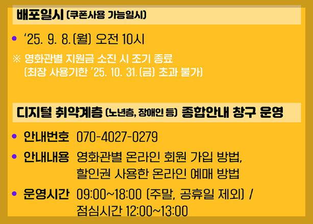 - A: 2025년 9월 8일 오전 10시부터 각 영화관별로 쿠폰 소진 시까지 사용할 수 있습니다. 서두르시는 것이 좋아요!