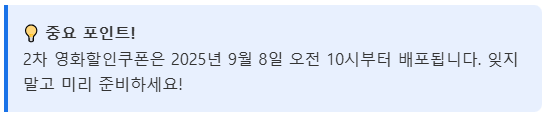 2차 영화할인쿠폰은 2025년 9월 8일 오전 10시부터 각 영화관이 보유한 수량이 모두 소진될 때까지 사용할 수 있습니다. 서두르지 않으면 할인 혜택이 빨리 사라질 수 있어요.