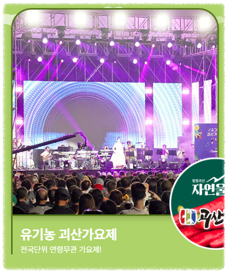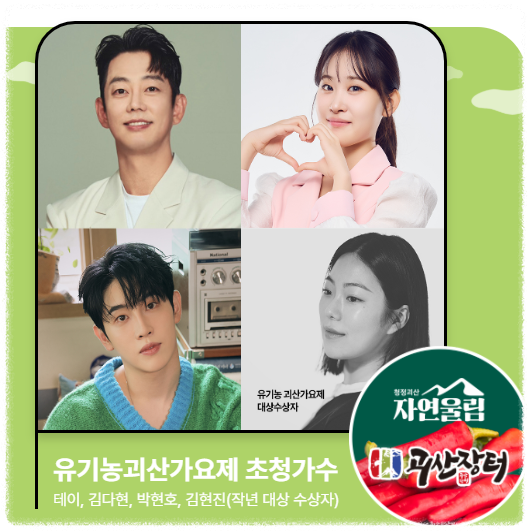 축제의 시작을 화려하게 장식할 인기 가수들의 무대! 김용빈, 진욱, 키썸, 장혜리 님 등 뜨거운 열기로 축제의 포문을 열어줄 거예요. - 유기농괴산가요제 및 핫&쿨 콘서트