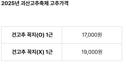 A: 2025년 기준으로, 건고추 꼭지 있는 한근은 약 17,000원 꼭지 없는 것은 19,000원입니다. 현장 직거래 특성상 시중보다 저렴하게 구매하실 수 있어요!