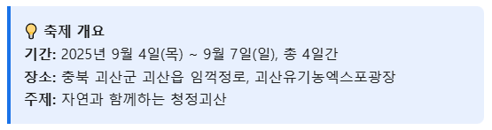 A: 축제는 2025년 9월 4일(목)부터 9월 7일(일)까지 4일간 충북 괴산군 괴산유기농엑스포광장에서 개최됩니다.