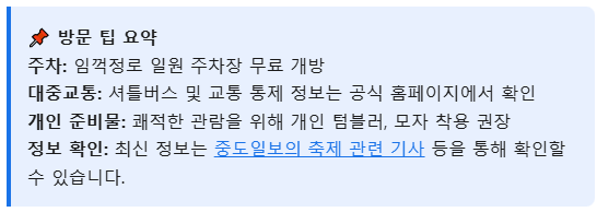 - 모자 및 양산 준비: 햇볕이 강할 수 있으니 모자나 양산을 준비하시면 더욱 편안한 관람이 가능합니다.