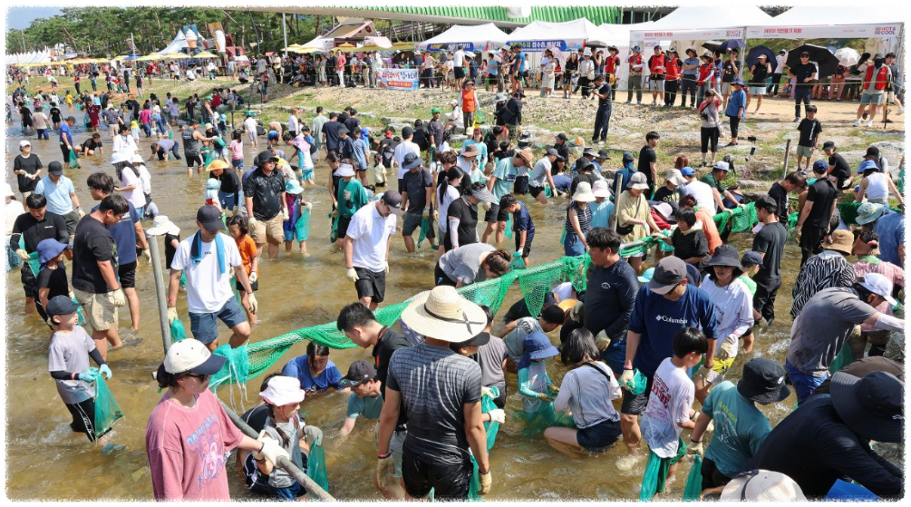 동진천변에서 직접 물고기를 잡아보는 이색적인 경험! 올해는 무려 15,000마리의 물고기가 방류되어 더욱 풍성한 재미를 약속합니다. - 괴산고추맛대회 & 매운맛 최강대전!
