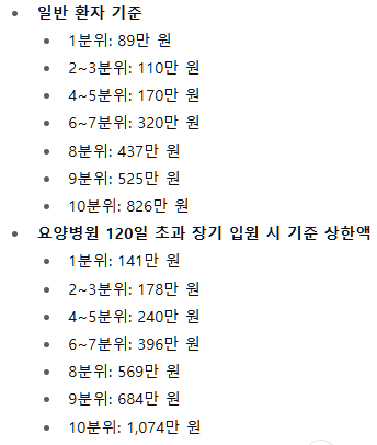 예를 들어 소득이 가장 낮은 1~2 분위는 연간 상한액이 약 100만 원 초반 수준으로 정해져 있고, 중간 소득층은 약 300만 원대, 고소득층은 600만 원 이상으로 책정됩니다. 이렇게 구간을 나누는 이유는 형편에 맞게 부담을 조정하기 위함입니다.